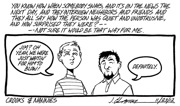 Available now! The first CROOKS & NANNIES book, collecting all the strips for 2011-2012 (with a few exclusive extras). If you'd like a copy